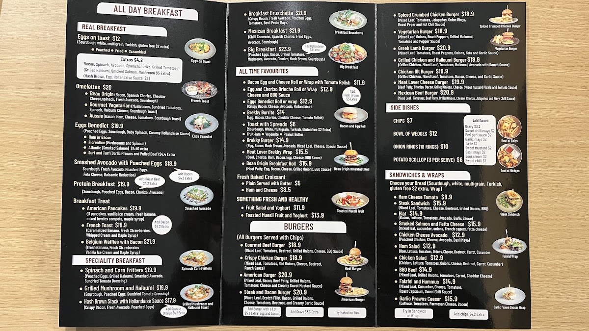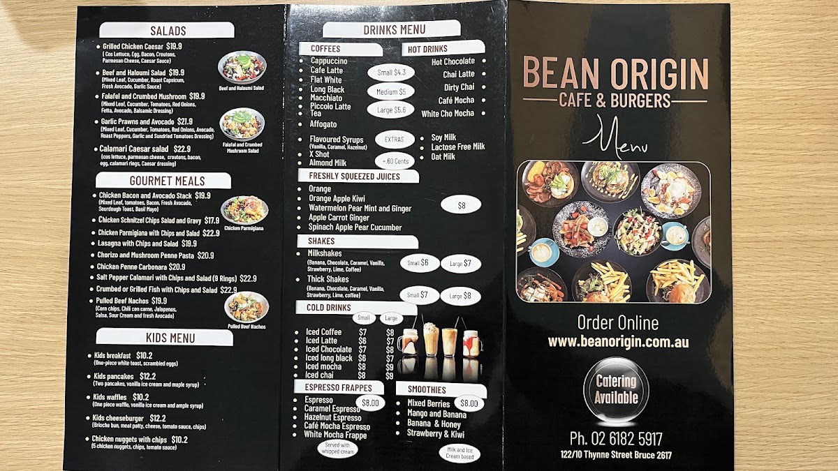 The menu at Bean Origin Bruce offers a diverse selection of options suitable for breakfast, light meals, and refreshing beverages. It is structured to cater to different meal preferences throughout the day, focusing on both food and drink categories.